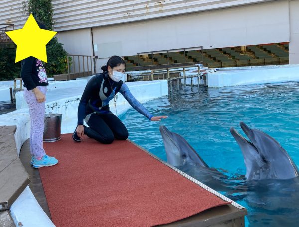 イルカに直接さわれる機会だったのですが、娘は怖がっていました。