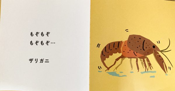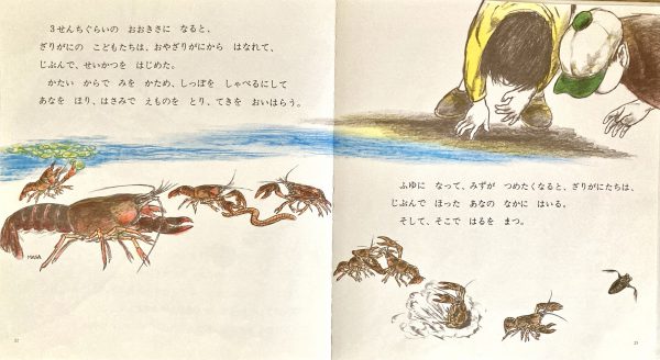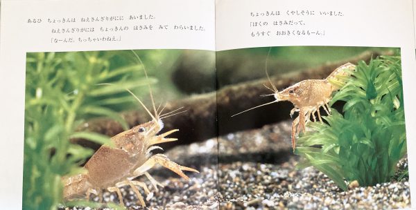 ザリガニのエサの取り合いの場面や脱皮、卵から子どもが産まれるなどが描かれています。