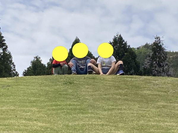 自然の中で遊ぶことは都会に住む子どもたちにとってはプライスレスです。山に囲まれた緑の丘を登ったり、降ったり、子どもたちは身体を動かしていっぱい自然を感じながら遊んでいました。顔を見せられませんが、最高の笑顔です。