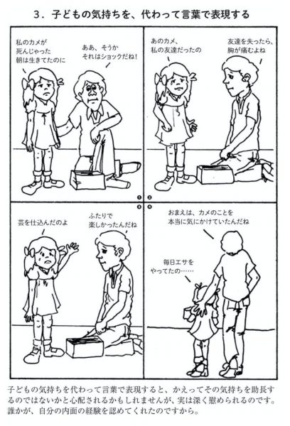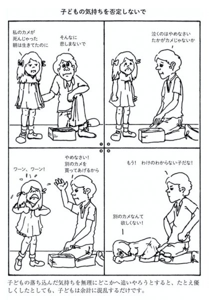 大人がついやってしまいがちな子どもの気持ちを否定している例です。