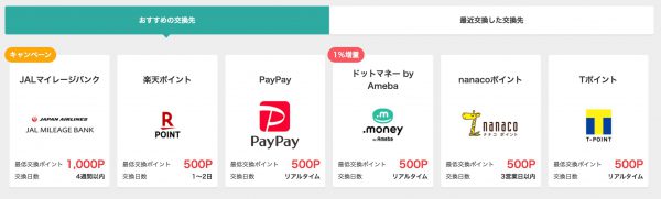 このポイントが楽天やAmazon、WAONのポイントなどに変わります。