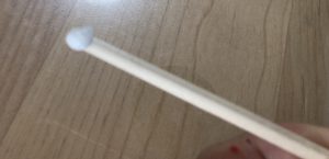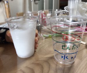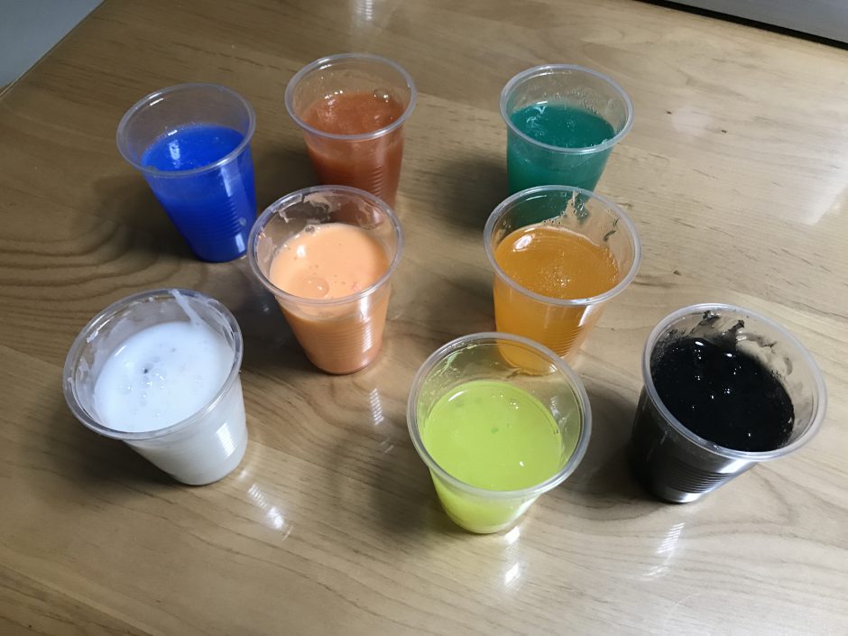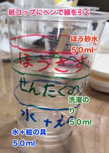 プラカップに水50mlに絵の具をわりばしの先に付ける。