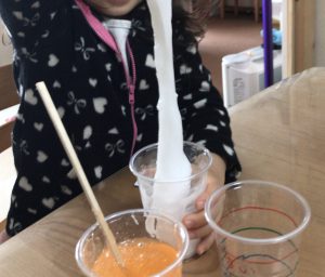 絵の具を混ぜての色の遊び、感触遊び、科学実験遊びを兼ねています。